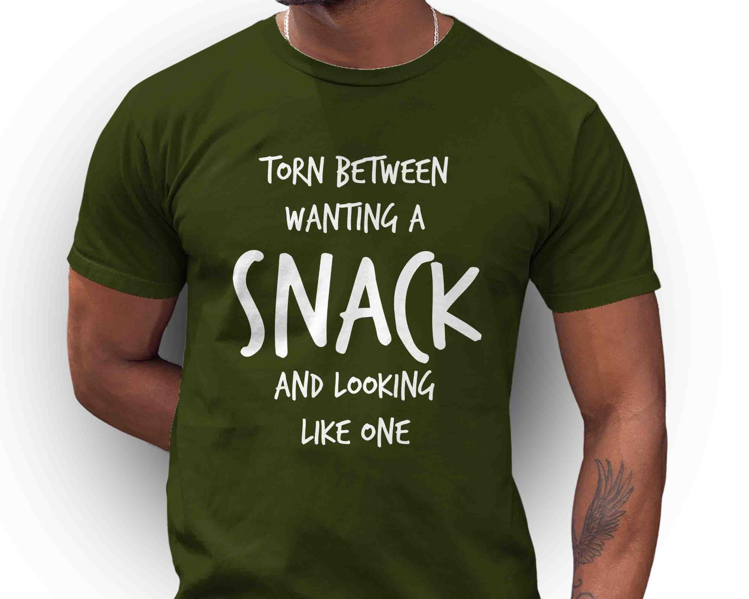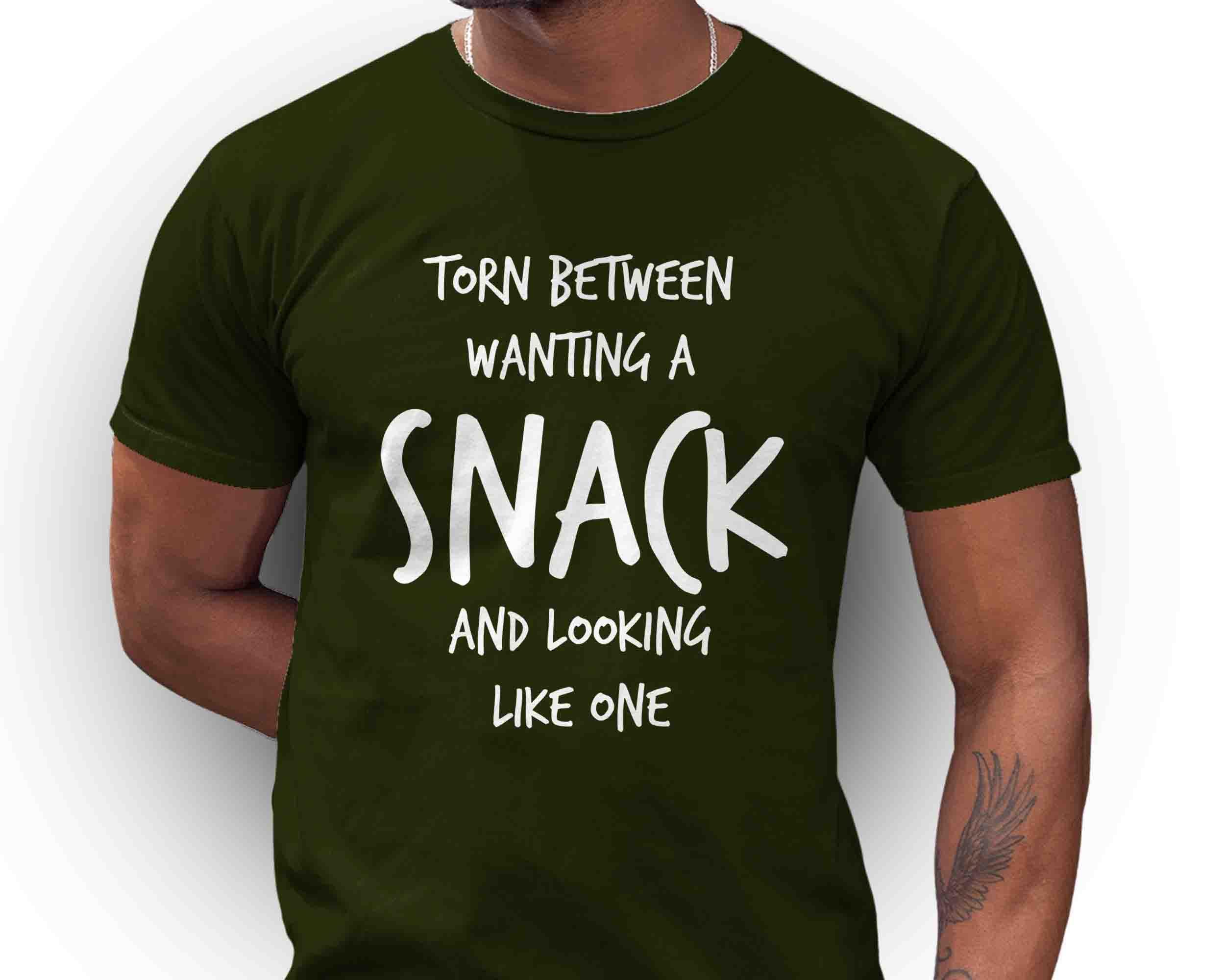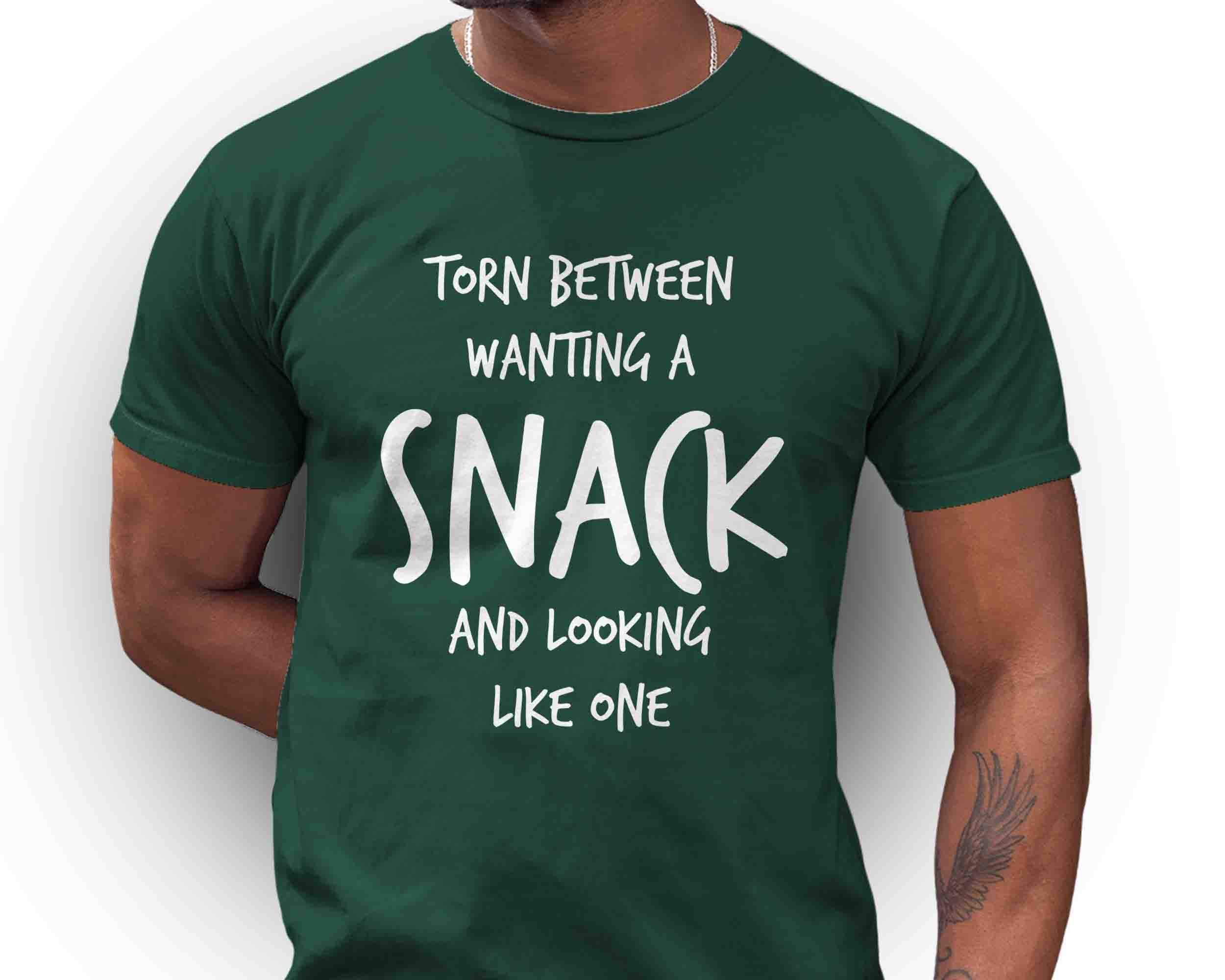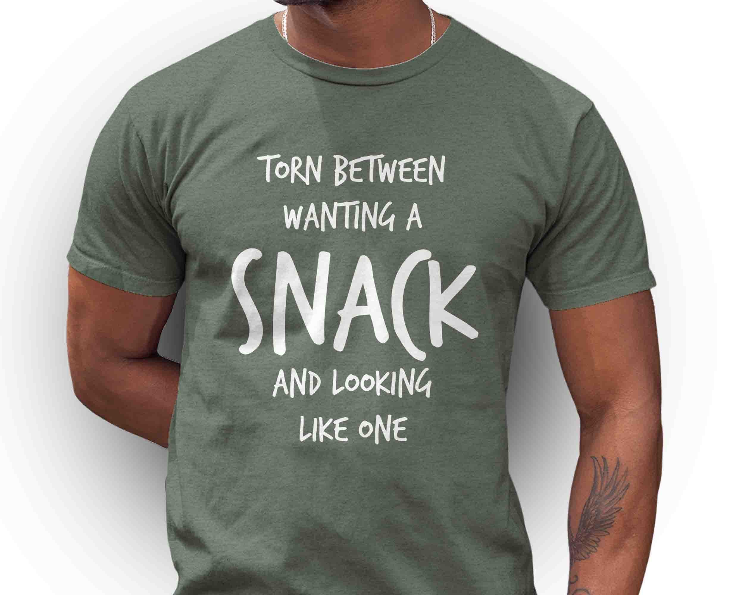 This funny tee is perfect for your next vacation or foodie event. Let everyone know you're torn between wanting a snack and looking like one.