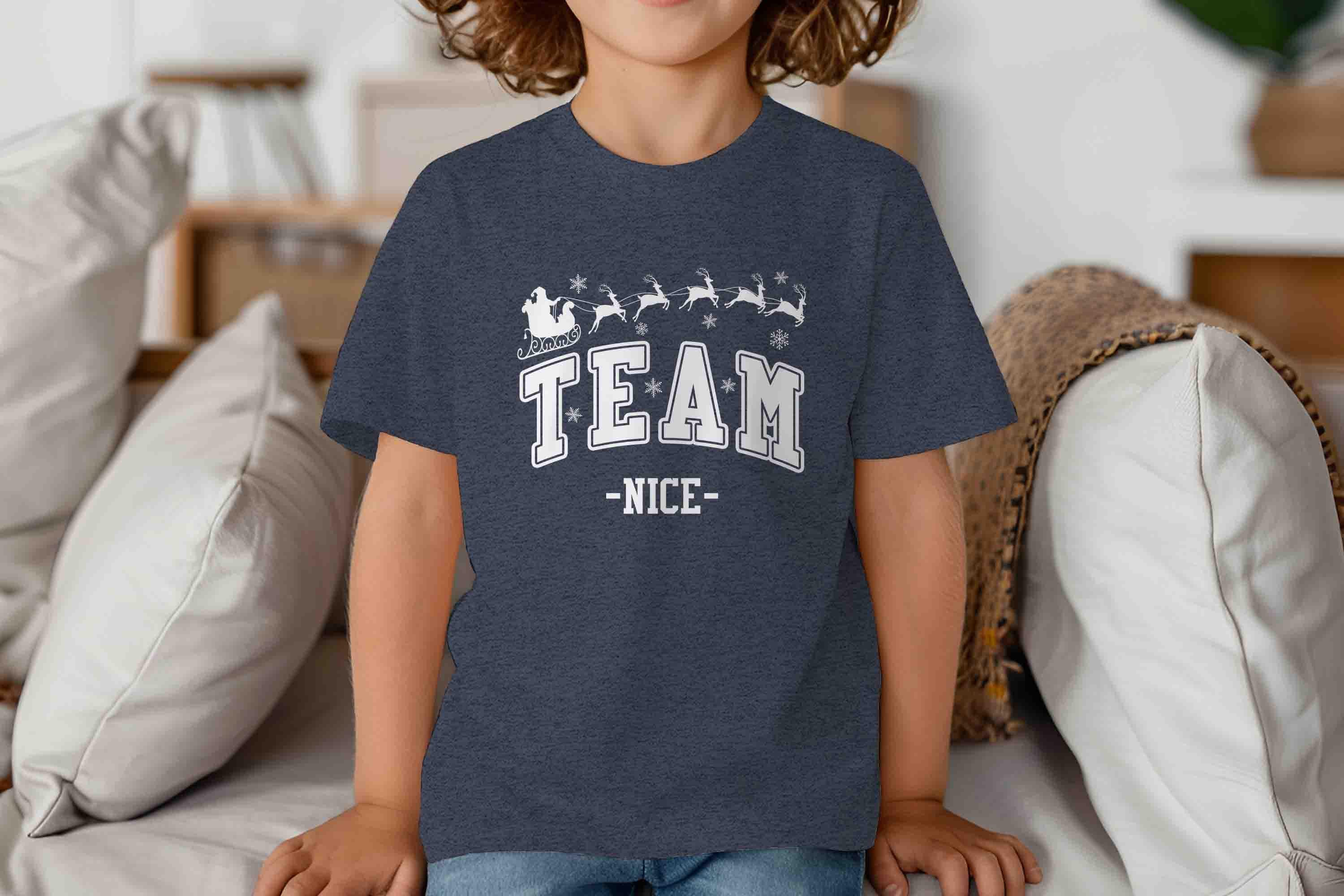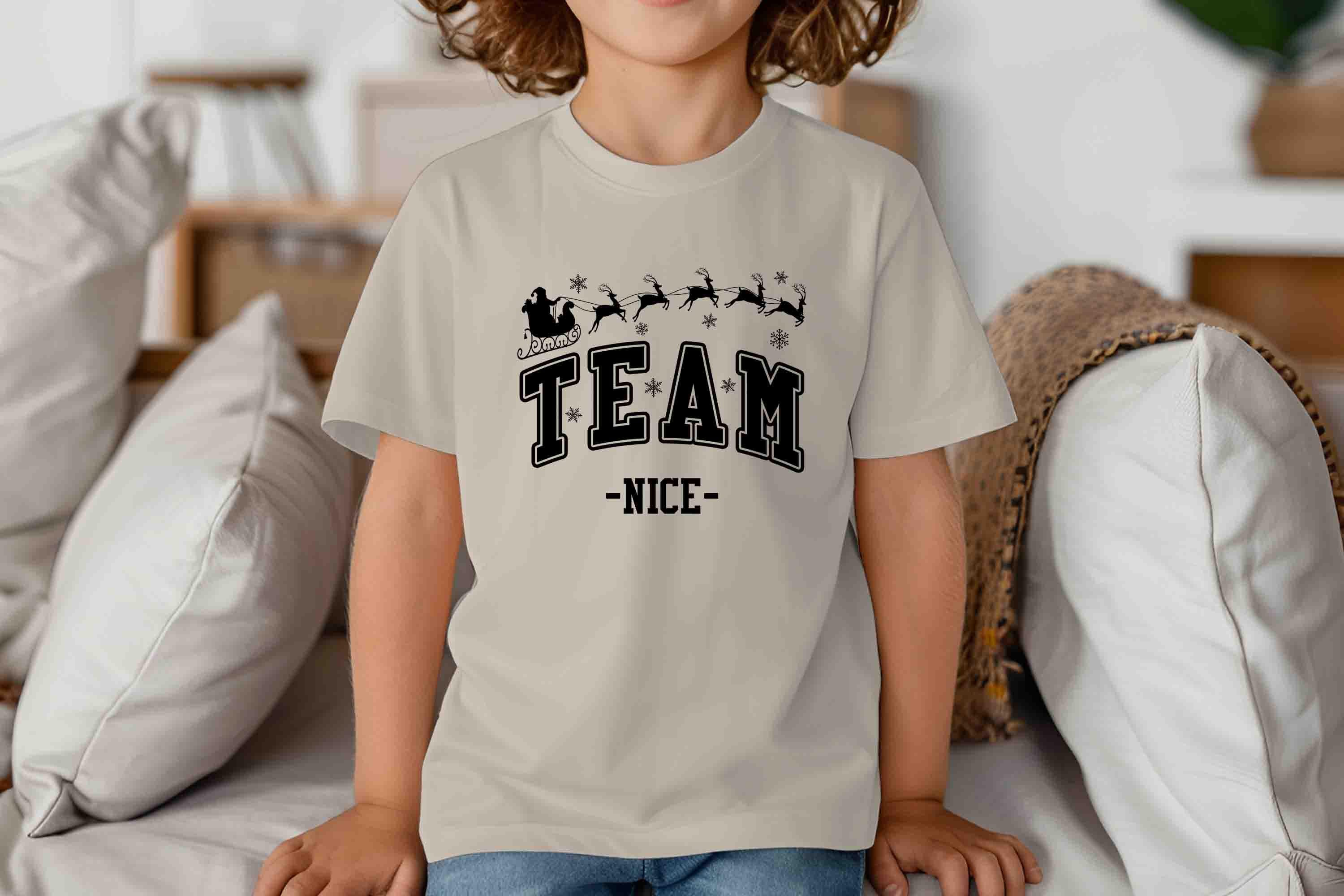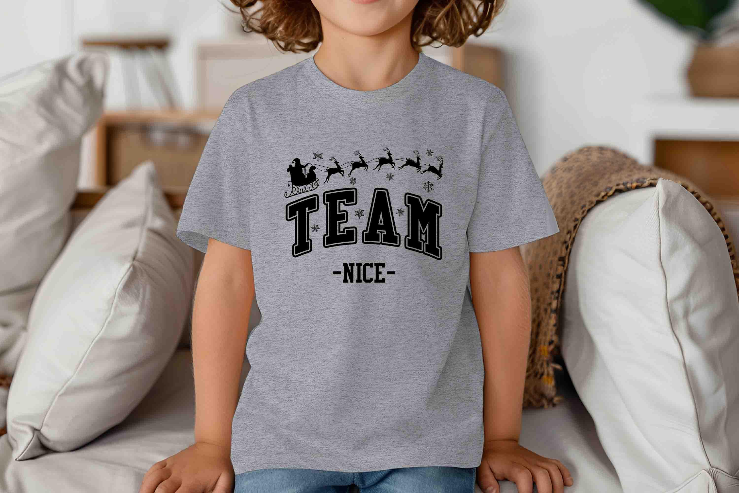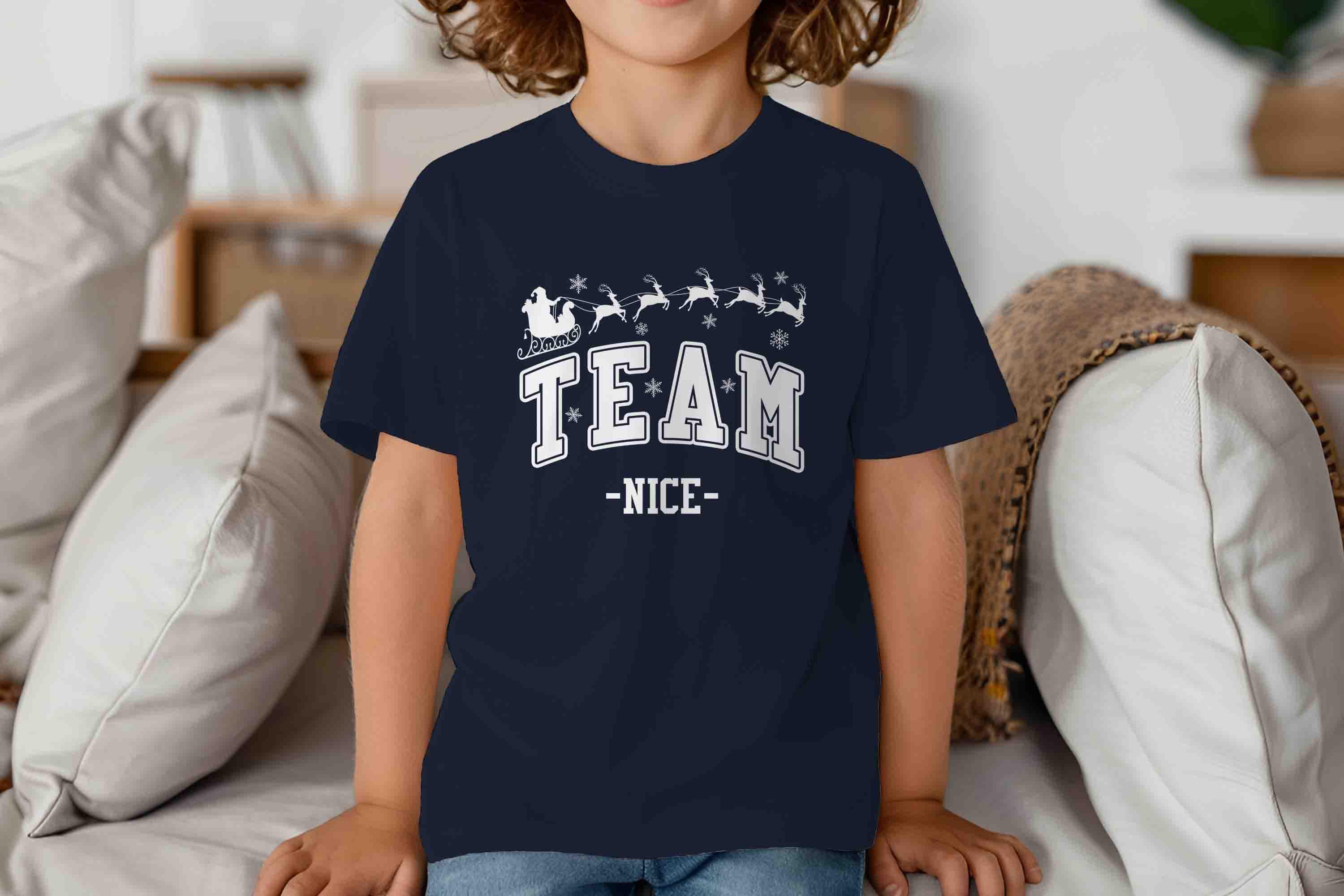 Get in the holiday spirit with this festive Team Nice Christmas Shirt! Featuring Santa and his reindeer flying across the chest with bold collegiate lettering, this tee is perfect for those proudly representing the Nice List this season.