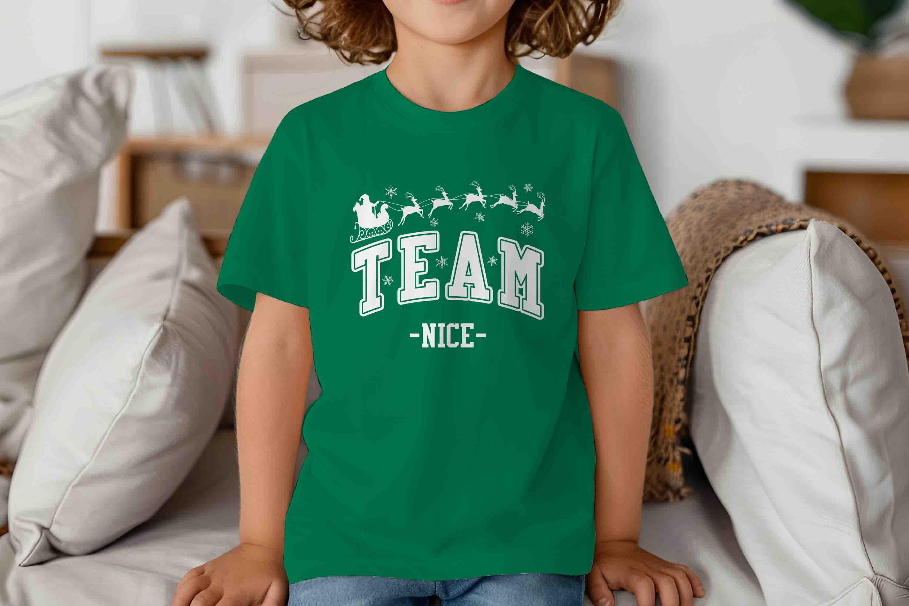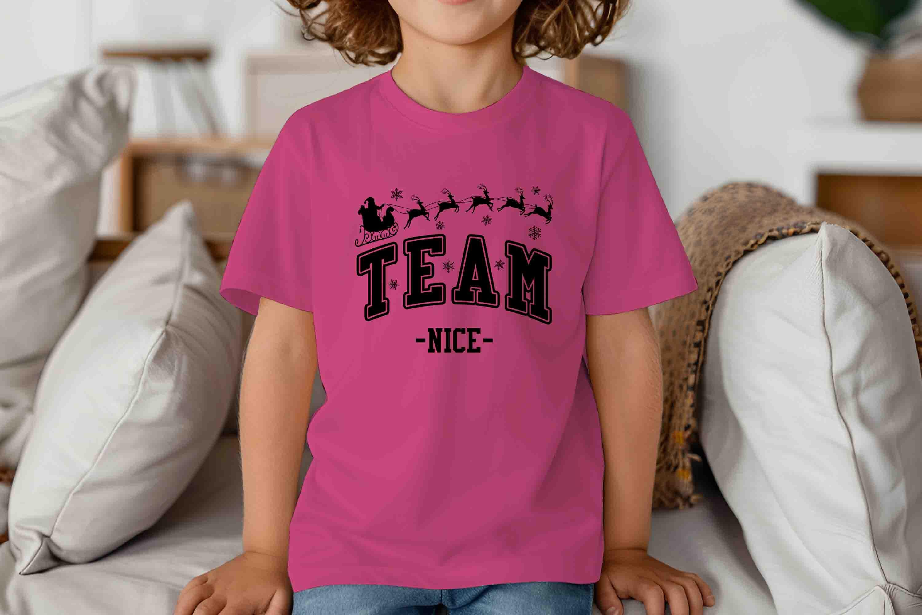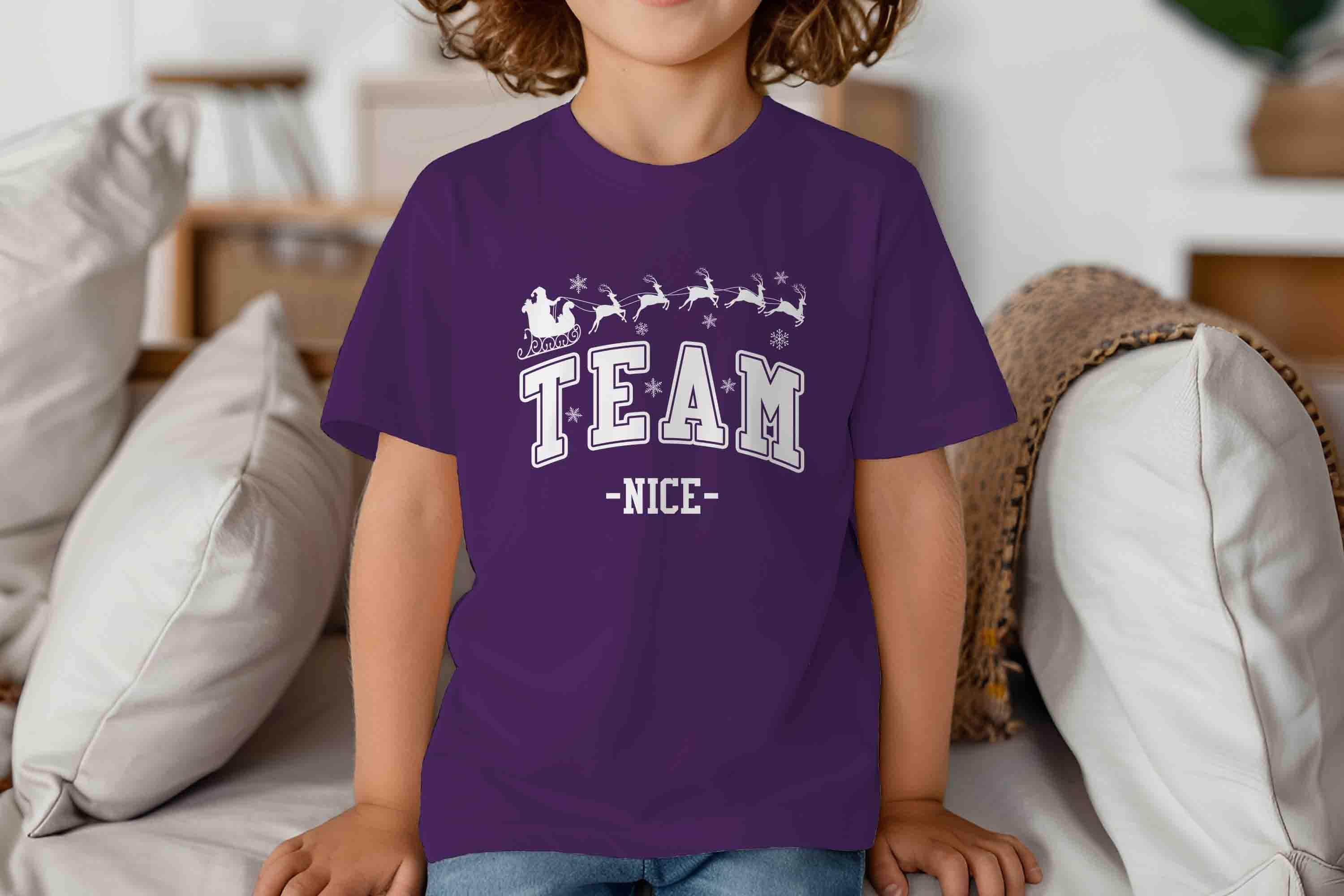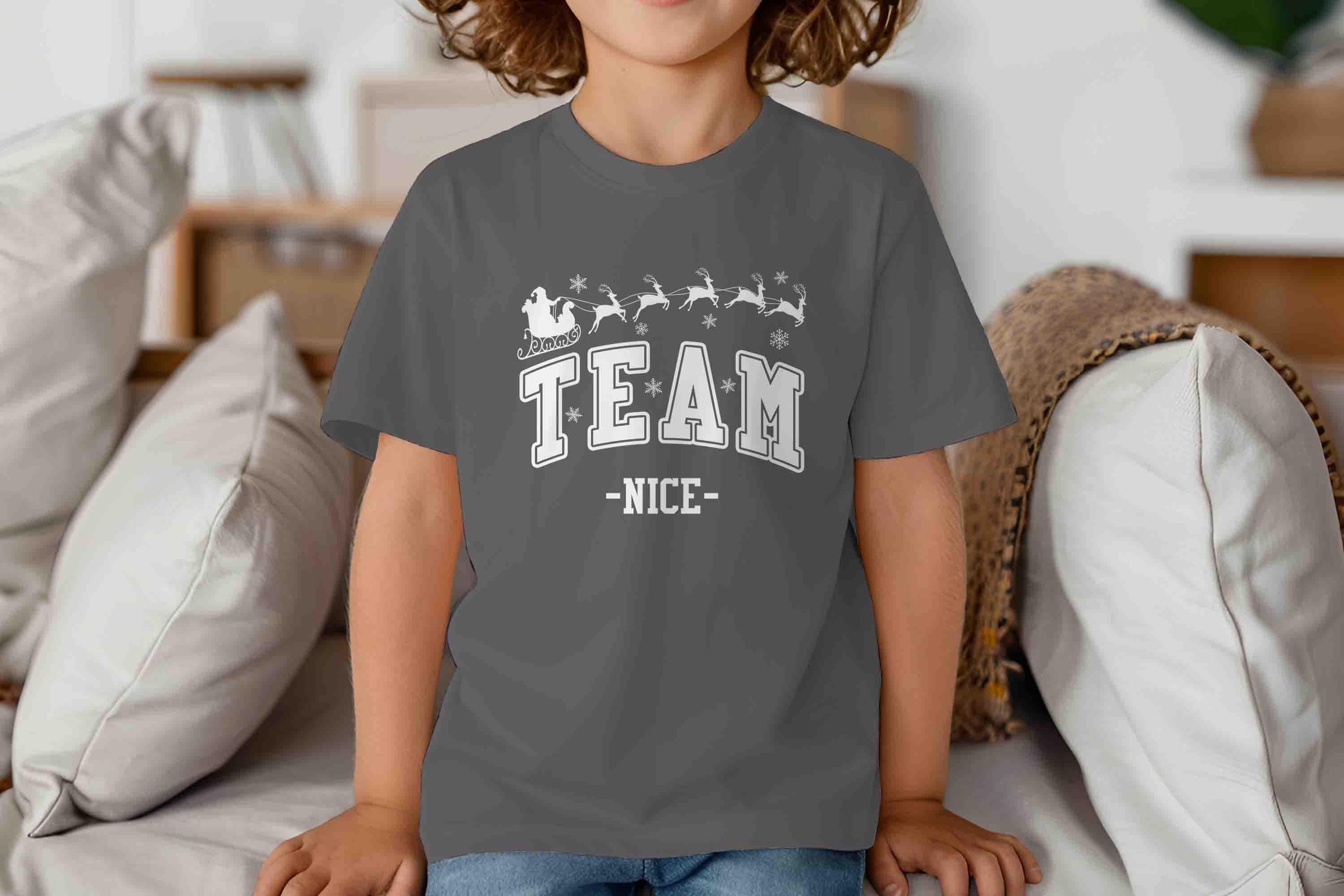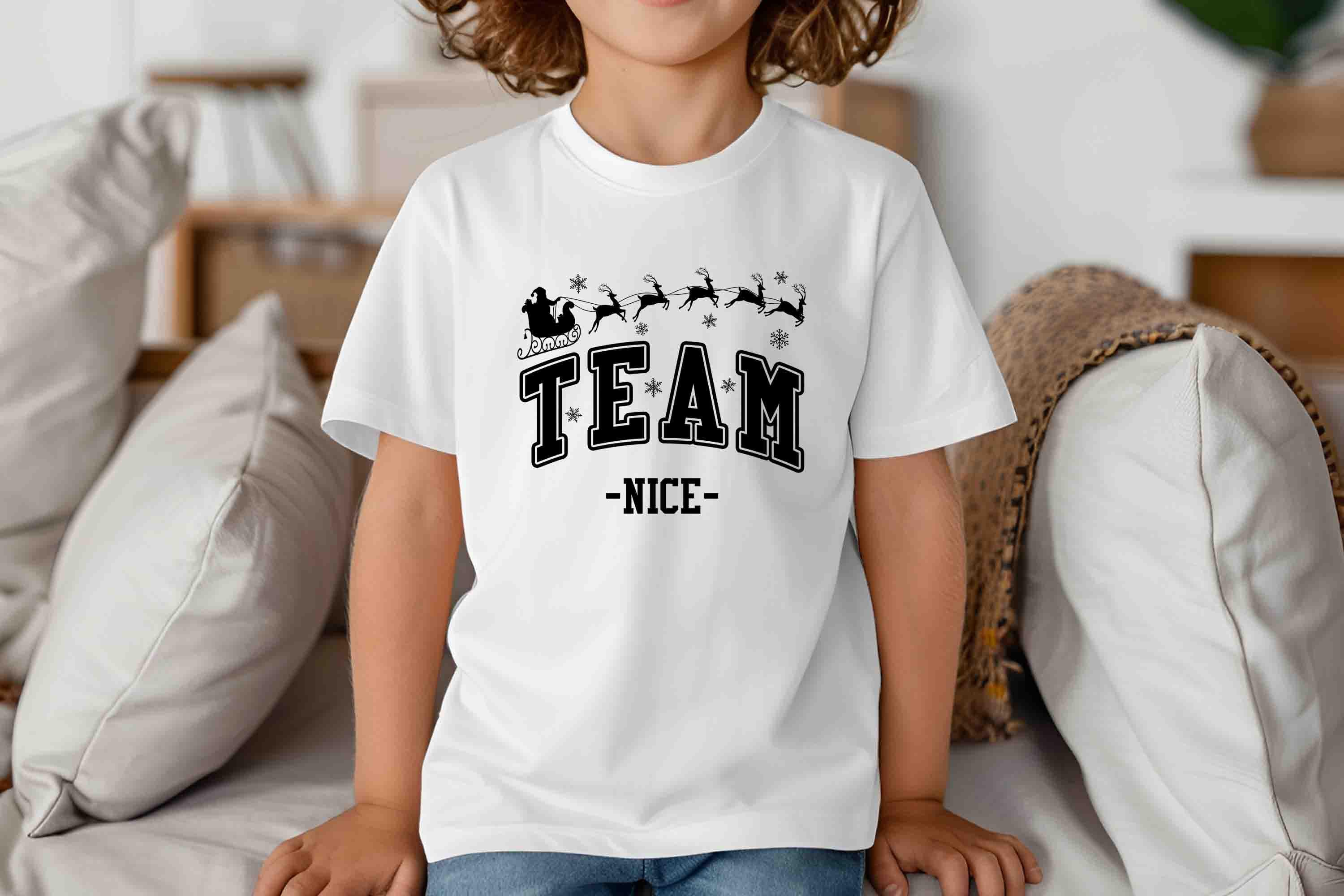 Get in the holiday spirit with this festive Team Nice Christmas Shirt! Featuring Santa and his reindeer flying across the chest with bold collegiate lettering, this tee is perfect for those proudly representing the Nice List this season.
