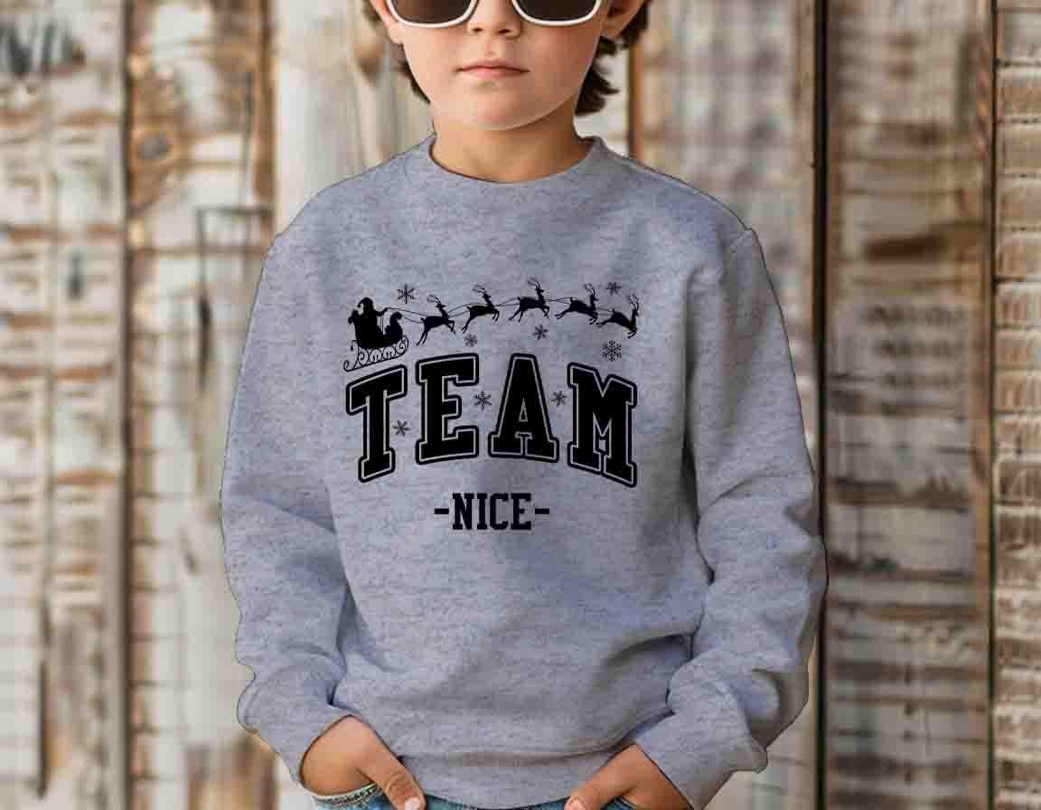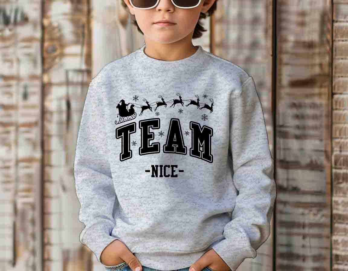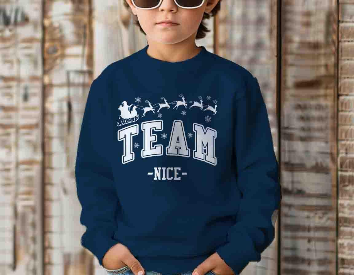 Get in the holiday spirit with this festive Team Nice Christmas Sweatshirt! Featuring Santa and his reindeer flying across the chest with bold collegiate lettering, this tee is perfect for those proudly representing the Nice List this season.