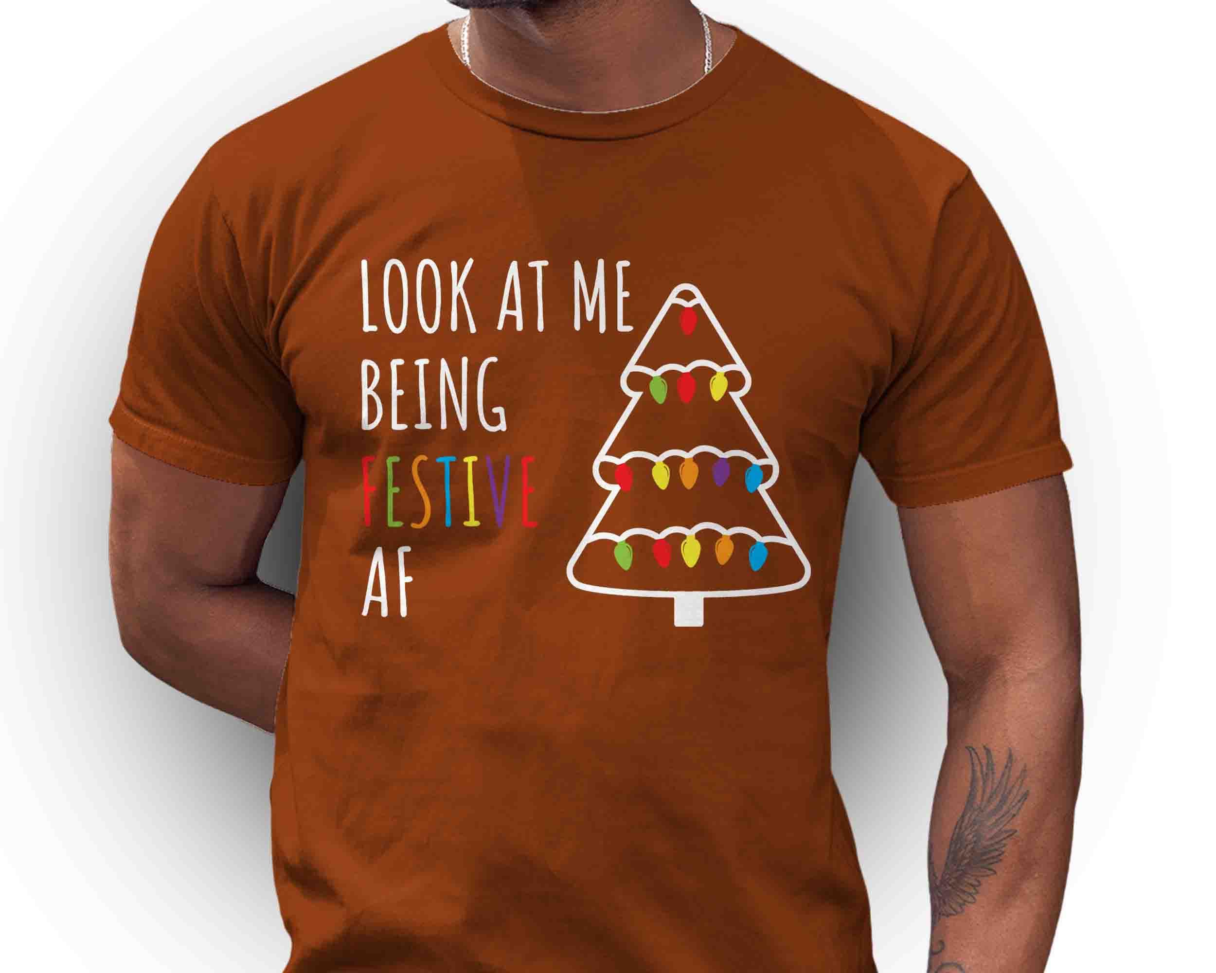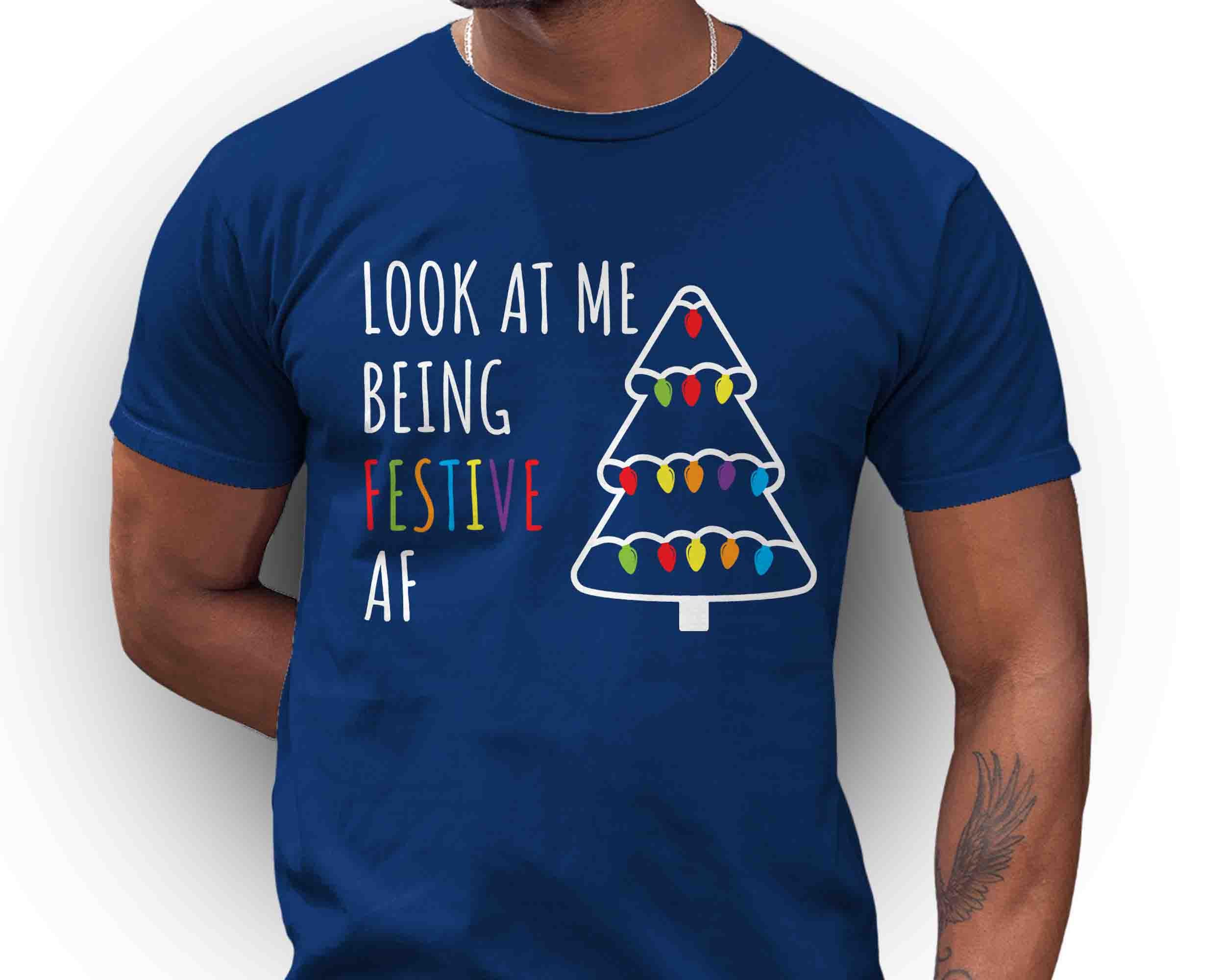 This funny shirt is perfect for those who may not be naturally festive around Christmas. If you want to show your holiday cheermeister friends that you're getting in on the holiday spirit this year, this graphic tee is perfect. This funny Christmas shirt reads 'Look At Me Being Festive AF' and features Christmas lights hung from a tree.