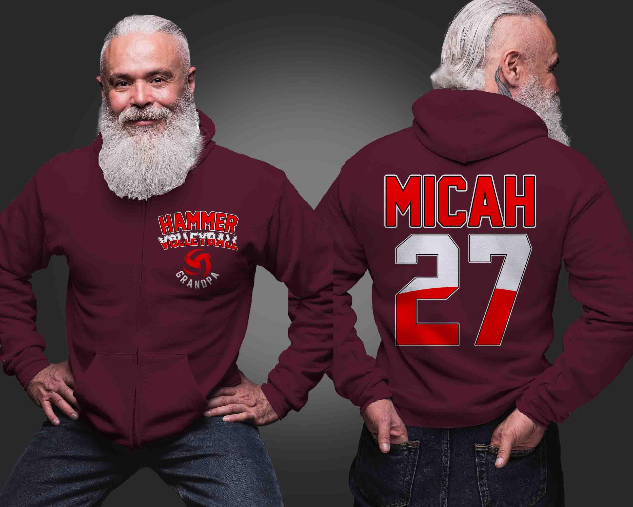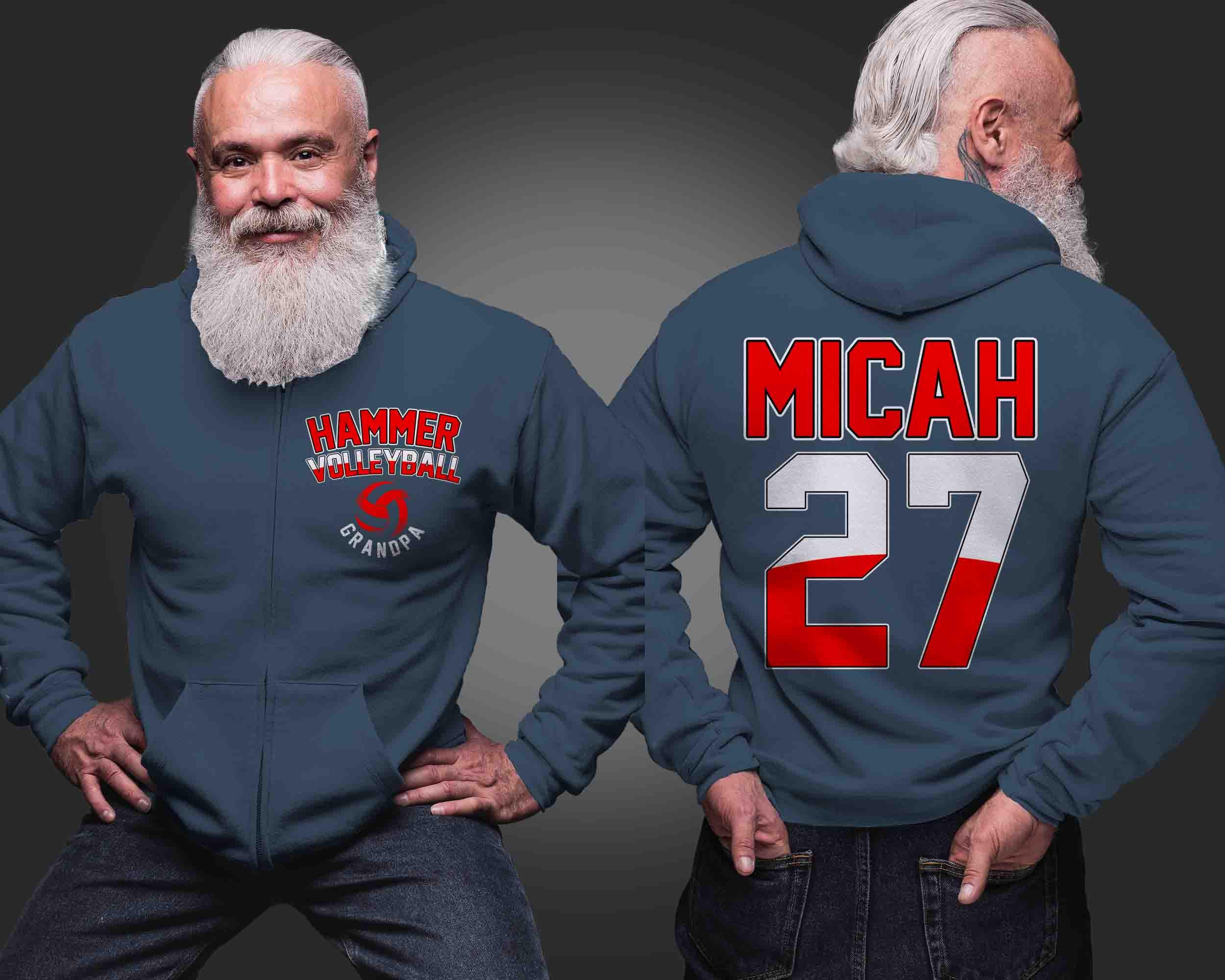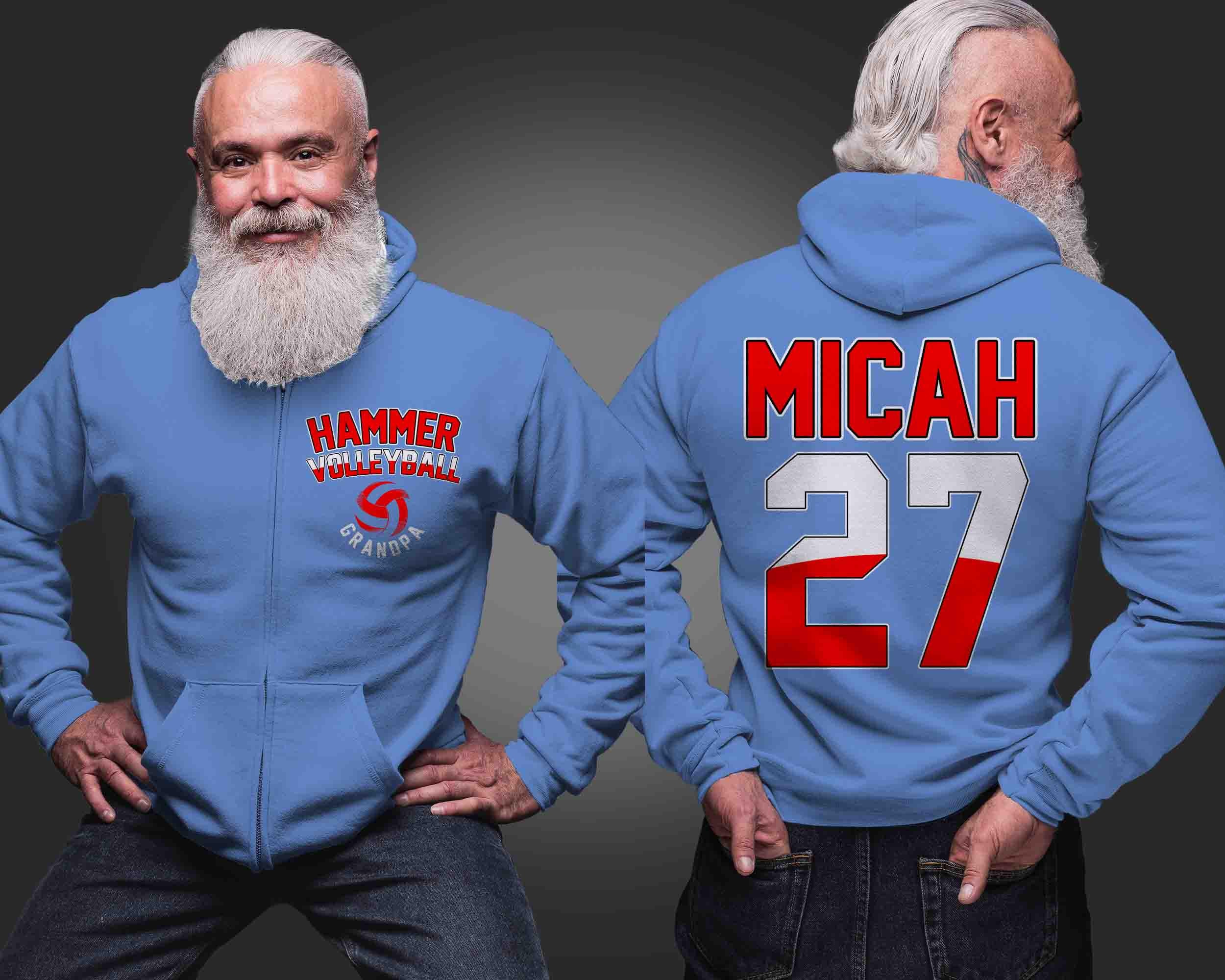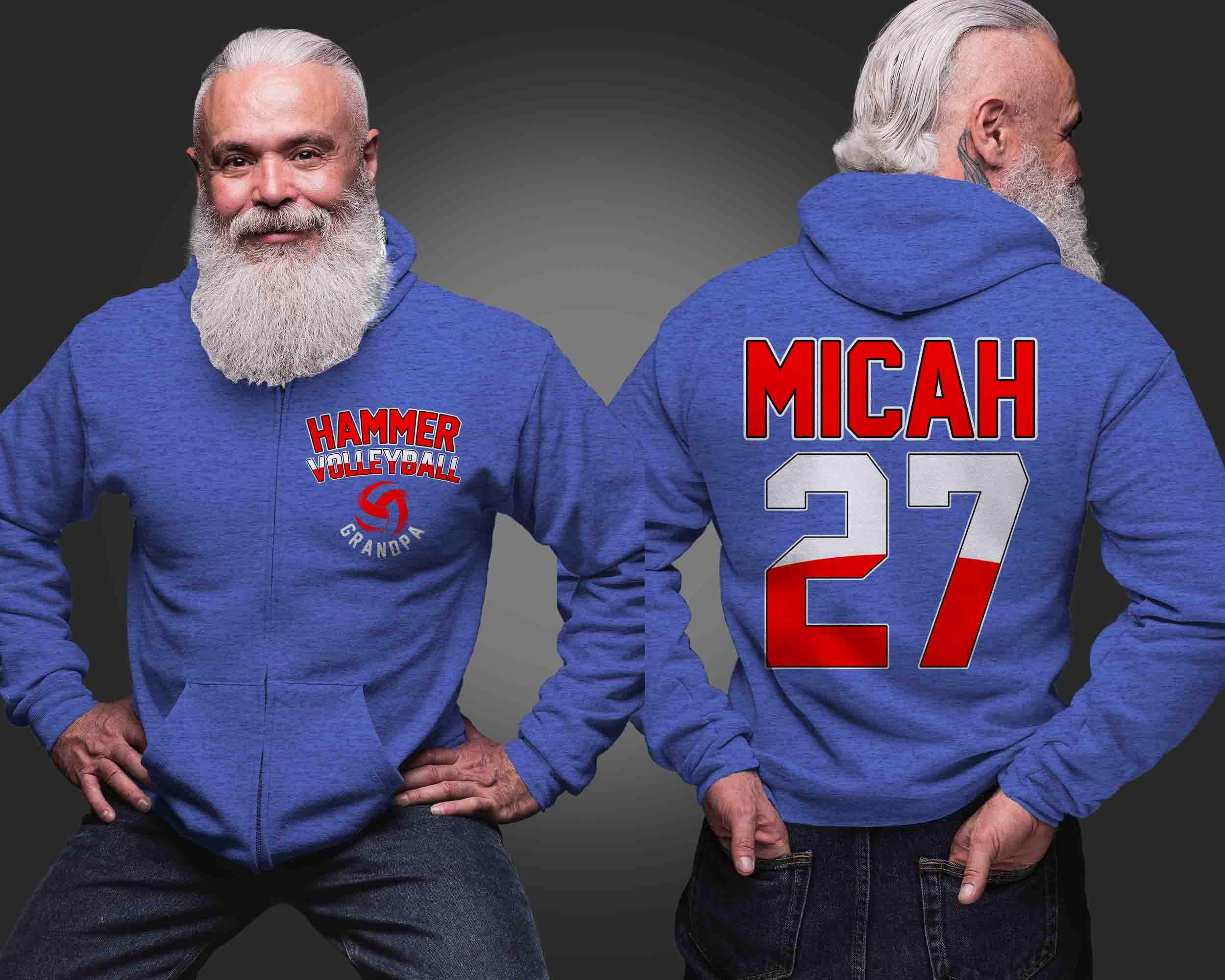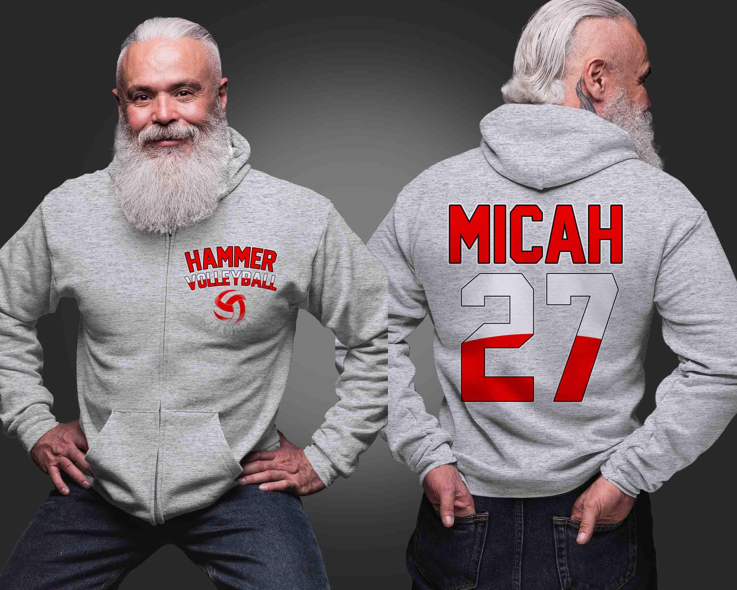 Celebrate the game of volleyball with this personalized, custom hoodie! Perfect for brothers, teammates, or anyone who shares a love for the game, this zip up hoodie lets you feature a volleyball player. You can customize it with their name, number, team name, or mascot that captures their camaraderie. Made from soft and comfortable fabric, this personalized volleyball zippered hoody sweatshirt is ideal for wearing to games, practices, or just showing off their passion for the sport. It's a unique and thoughtful gift for any volleyball player, from intermural to seasoned athletes. Also great for volleyball dads and moms to show their pride!