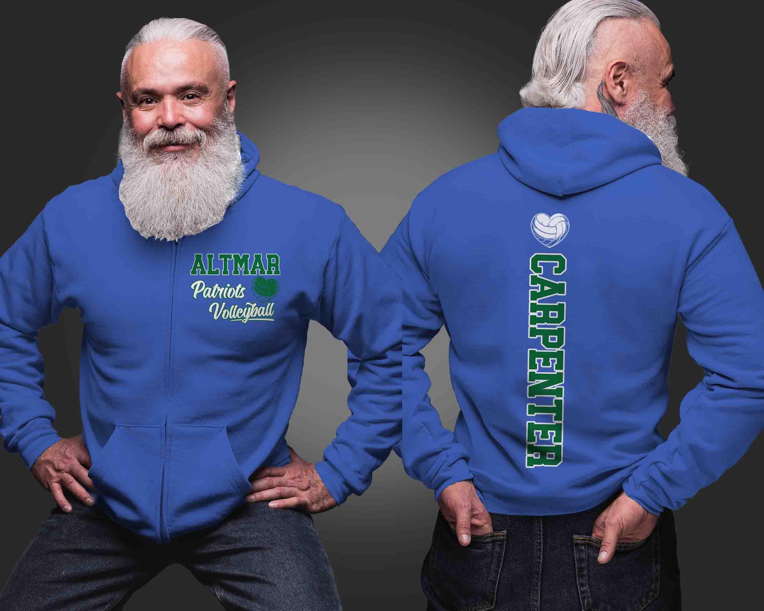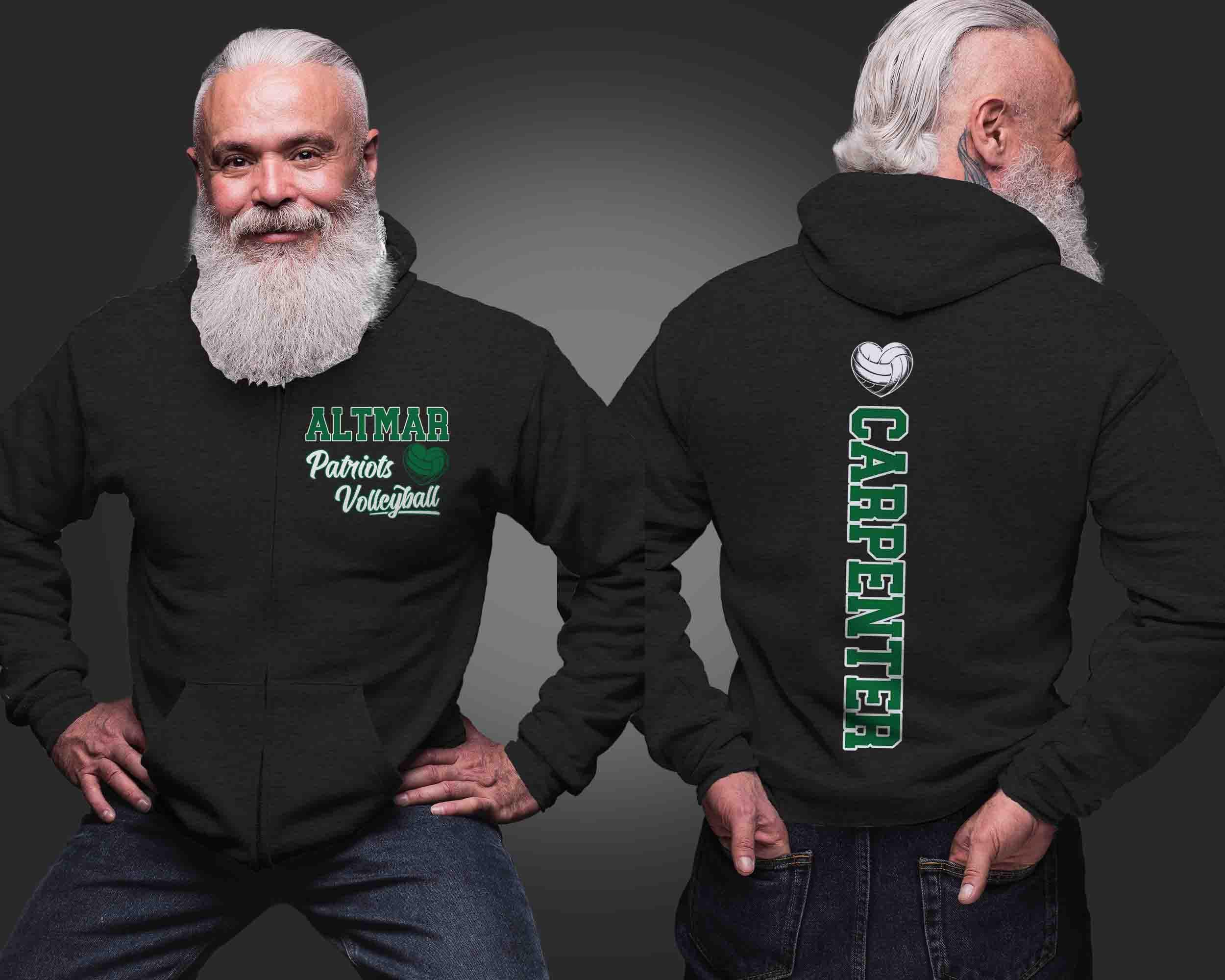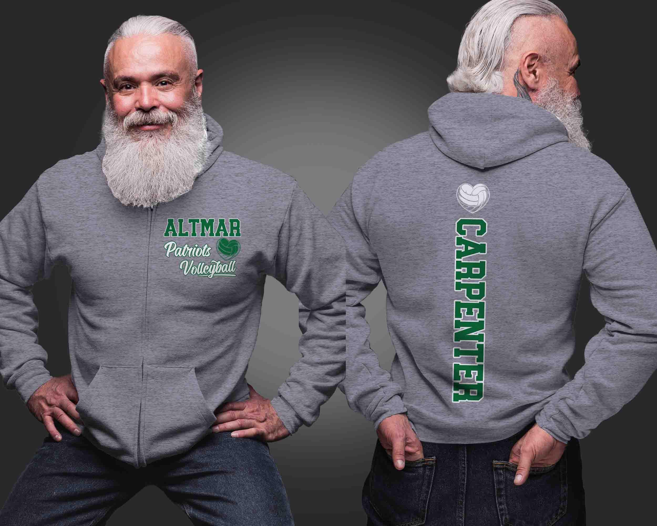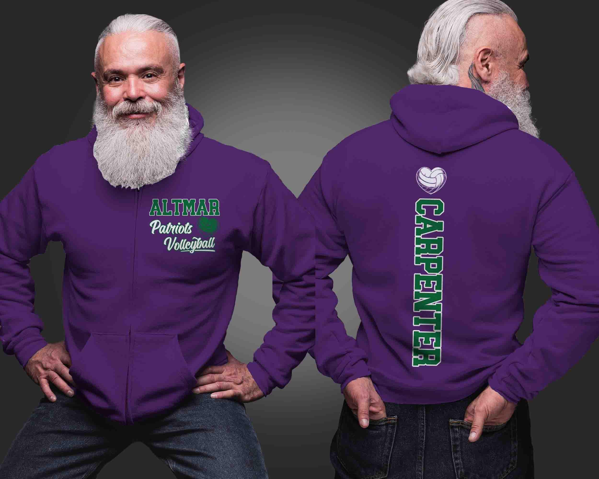 Celebrate the game of volleyball with this personalized, custom hoodie! Perfect for brothers, teammates, or anyone who shares a love for the game, this zip up hoodie lets you feature a volleyball player. You can customize it with their name, number, team name, or mascot that captures their camaraderie. Made from soft and comfortable fabric, this personalized volleyball zippered hoody sweatshirt is ideal for wearing to games, practices, or just showing off their passion for the sport. It's a unique and thoughtful gift for any volleyball player, from intermural to seasoned athletes. Also great for volleyball dads and moms to show their pride!