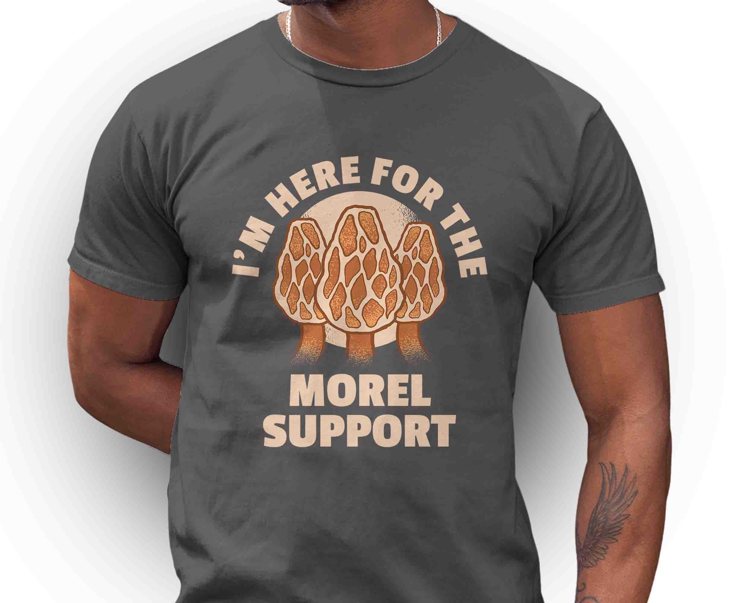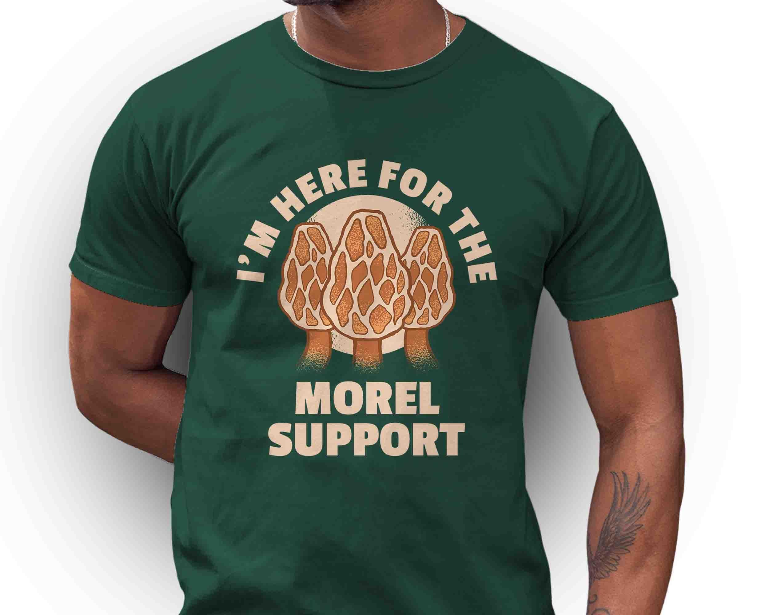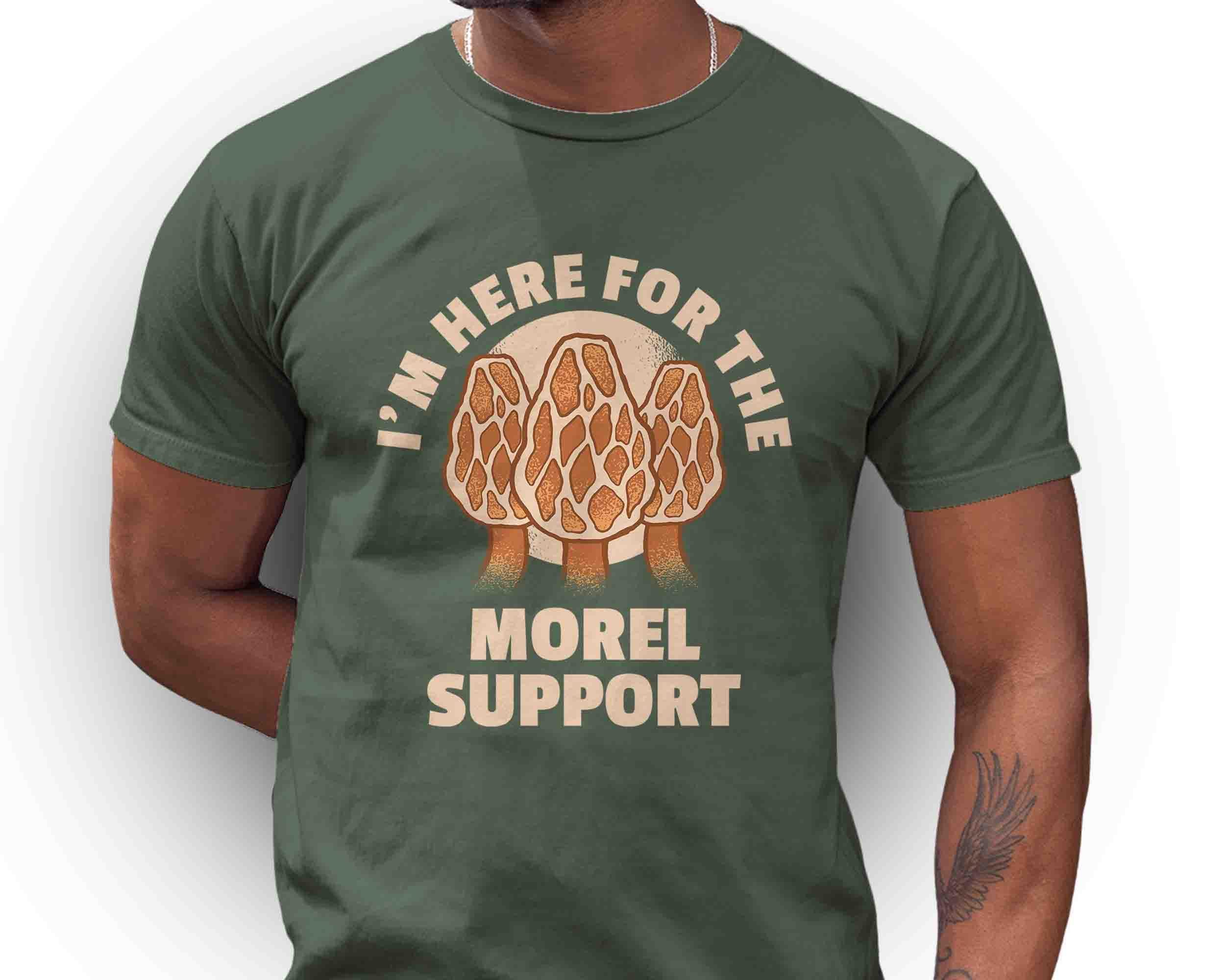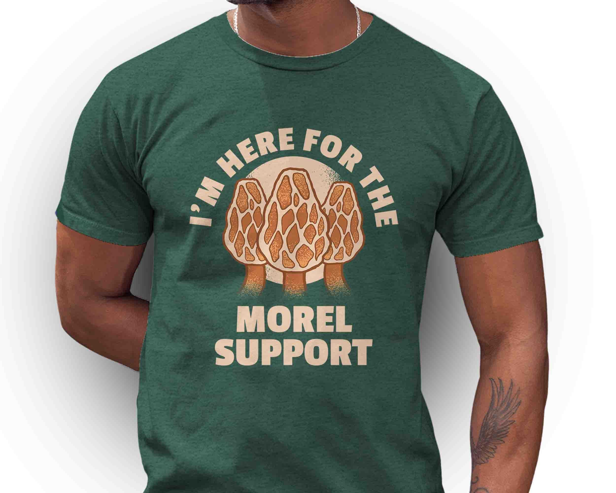 Bring your sense of humor to the hunt with our “I'm Here For The Morel Support” T-shirt! 🍄 Perfect for mushroom lovers, nature explorers, and anyone who appreciates a good fungi pun. Featuring hand-drawn morel mushrooms and bold vintage lettering, this tee is soft, witty, and made for adventure - from forest trail foragers to farmers markets.