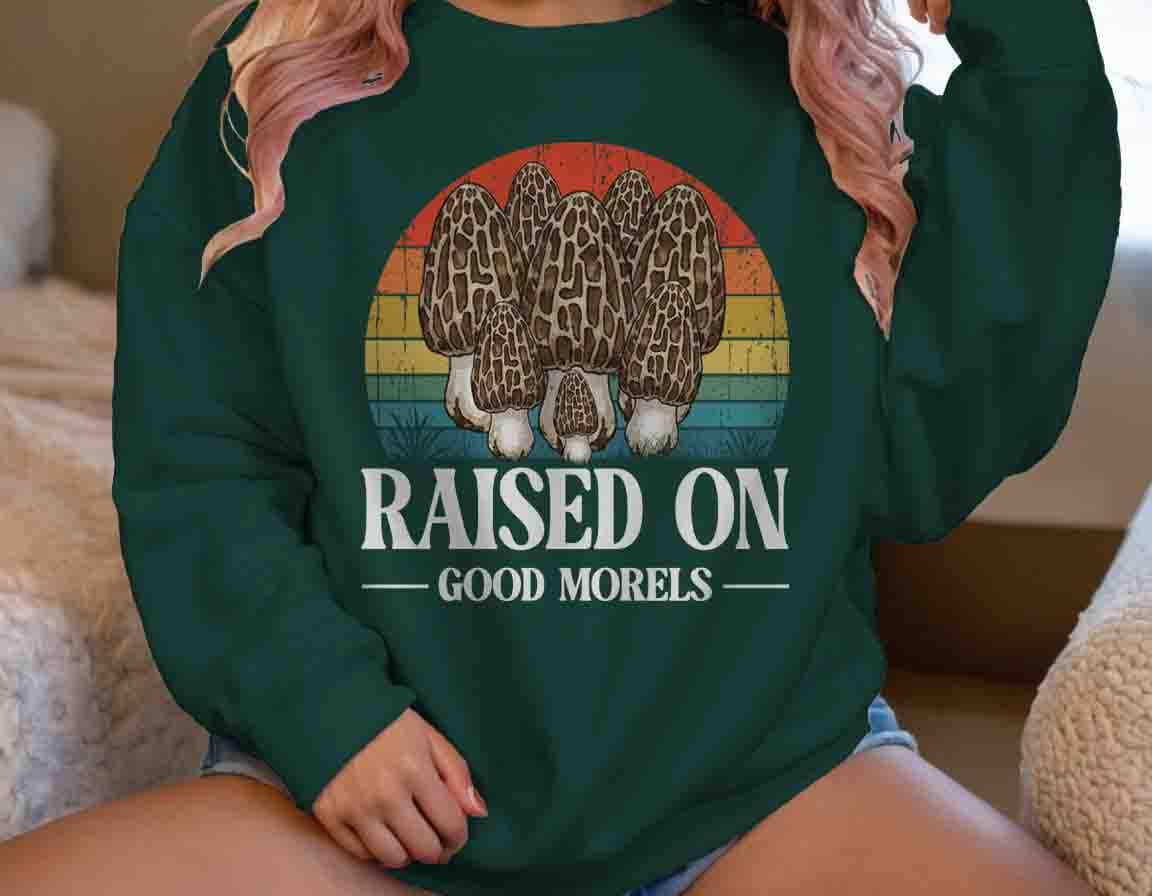 Celebrate your roots with a little fungi humor! 🍄 Our “Raised on Good Morels” Sweatshirt  is perfect for mushroom hunters, nature lovers, and anyone who grew up with good values (and great morels). Featuring a hand-illustrated morel design against a retro sunset backdrop, this warm fleece crewneck brings vintage vibes and woodland charm wherever you go.