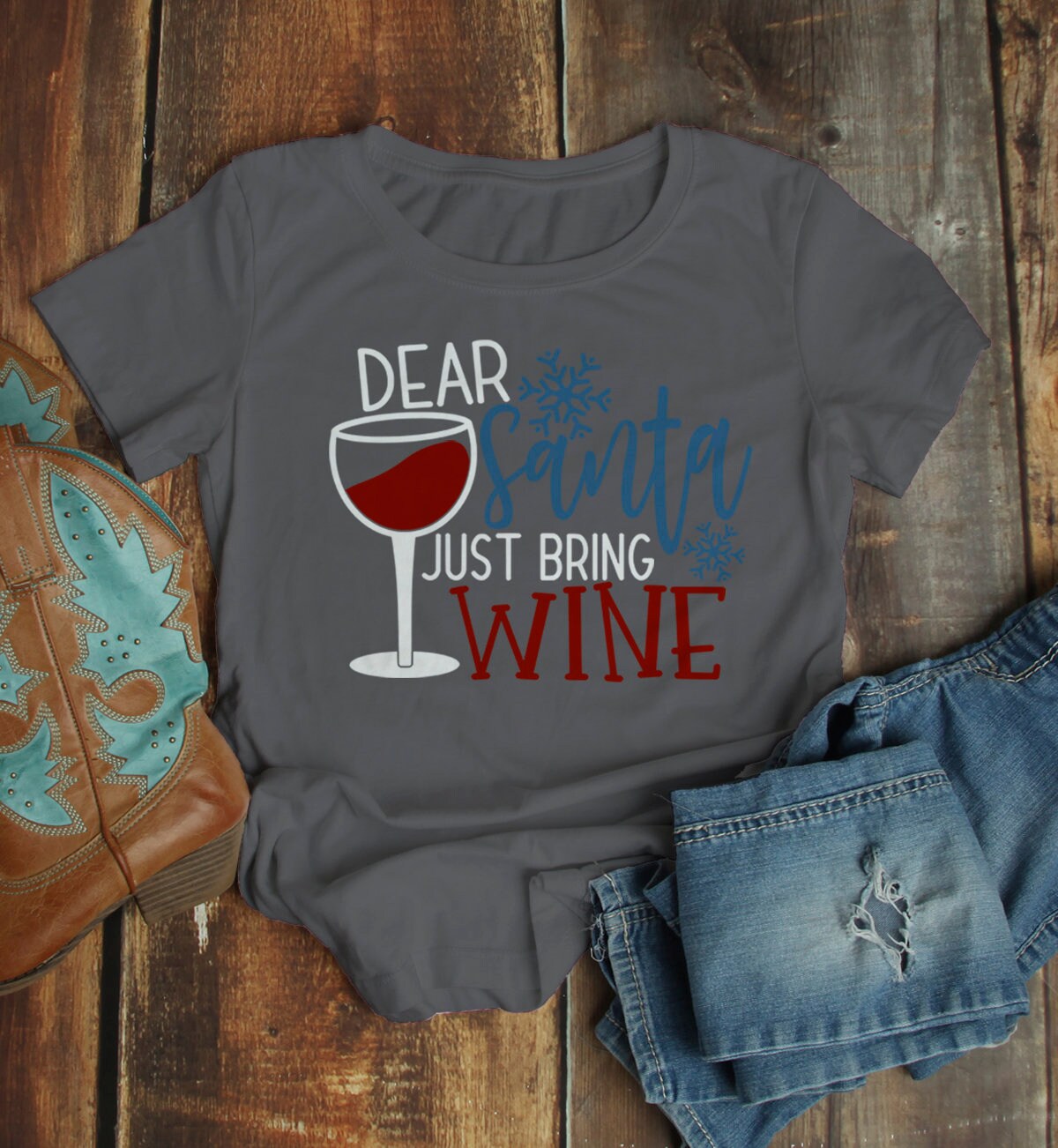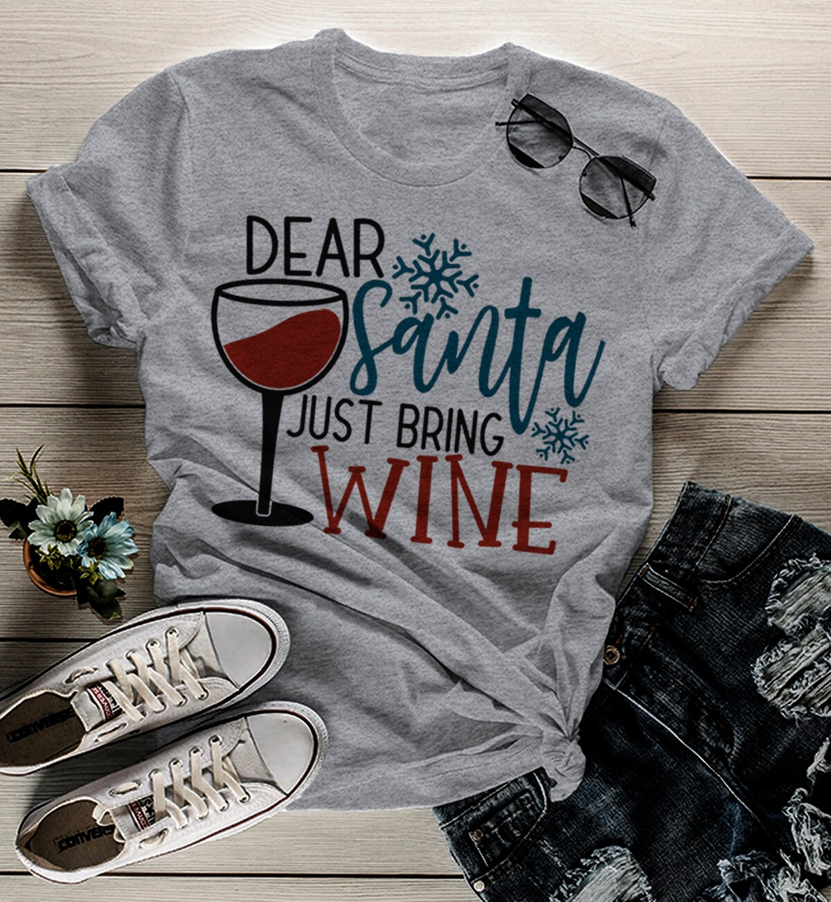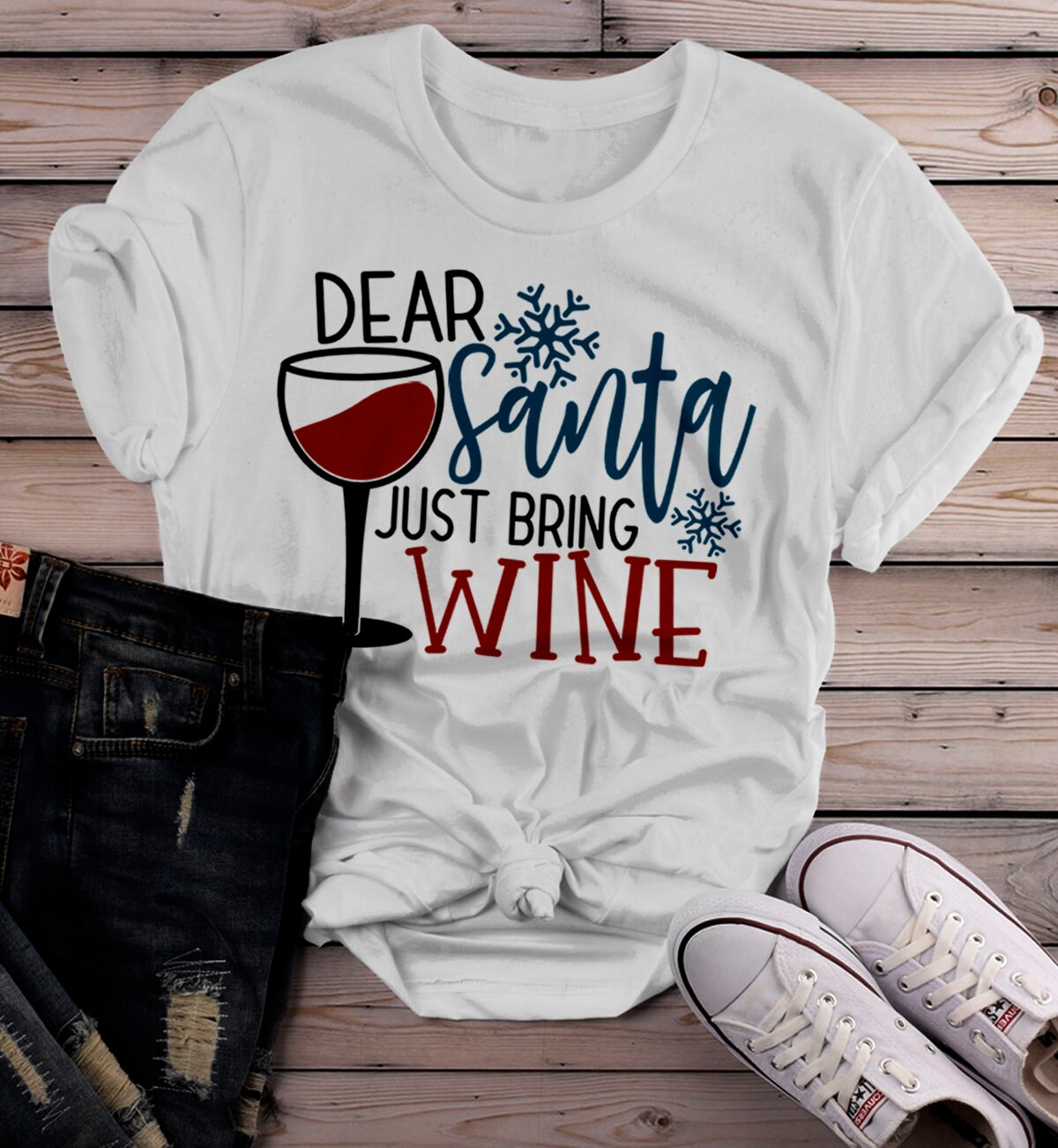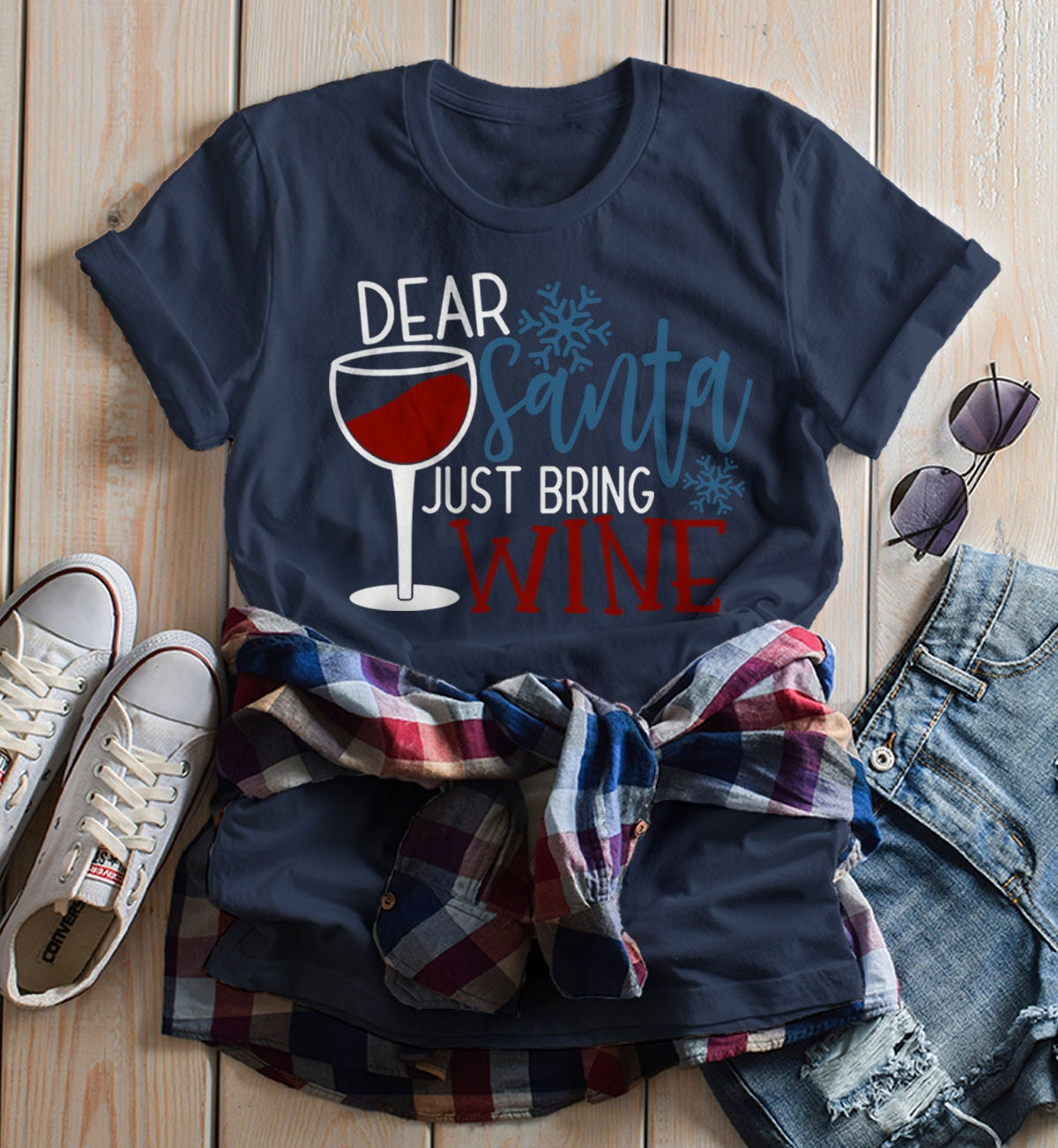 Women's Funny Christmas T Shirt Dear Santa Bring Wine Shirts Wino Tee Graphic Xmas Tshirt